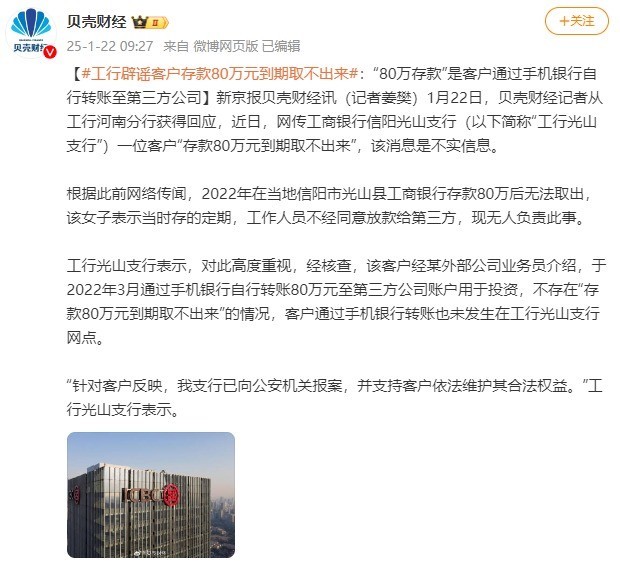 1月22日,新京报贝壳财经记者从工行河南分行获得回应,近日,网传工商银行信阳光山支行(以下简称“工行光山支行”)一位客户“存款80万元到期取不出来”,该消息是不实信息。
